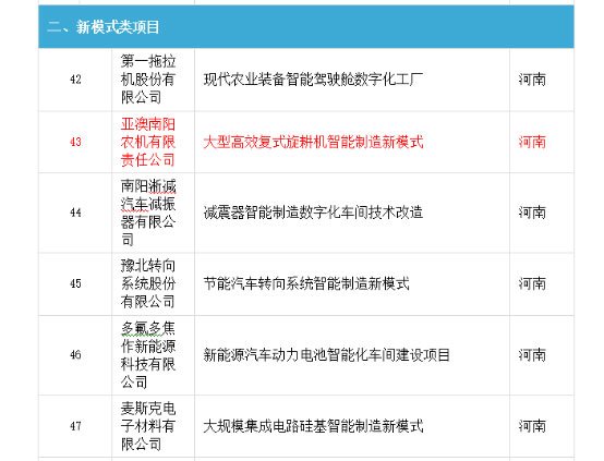 近日,亞澳農機被國家工信部評為2017年智能制造綜合標準化與新模式應用示范企業(yè)。據了解,這次全國智能制造綜合標準化專(zhuān)項項目批準企業(yè)43 家,河南省內2家,為機械工業(yè)第六設計研究院,洛陽(yáng)軸研科技股份有限公司國有大型企業(yè);新模式應用立項51家,河南省僅批準6家,亞澳智能化制造新模式成為業(yè)界首家,并獲得國家專(zhuān)項資金補貼。